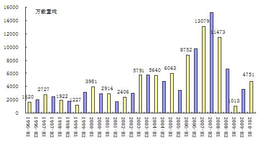 圖1. 1996-2010年訂單變化趨勢(shì)(半年度)