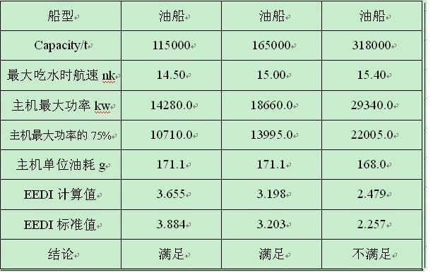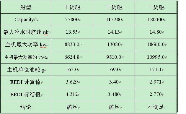 按EEDI的計算公式,對常規(guī)的三艘散貨船(75800t、115280t、180000t)進行計算結(jié)果DWT75800t散貨船符合要求有余度;DWT115280t散貨船符合要求無余度;DWT180000t散貨船不滿足要求(詳見附表1)。
