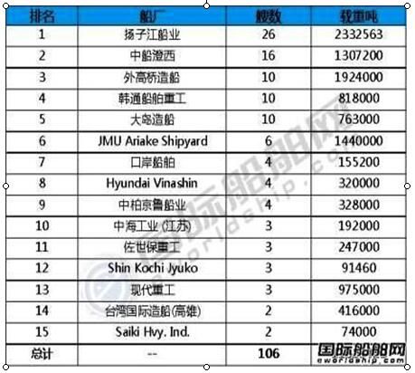 表:2017年1-8月散貨船新簽訂單前15船廠(按艘數(shù))