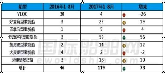 克拉克森數(shù)據(jù)統(tǒng)計(jì)顯示,2017年1-8月,全球散貨船新簽訂單119艘,合計(jì)12216923載重噸,相比2016年同期的46艘,13189568載重噸,艘數(shù)和載重噸分別同比上升158.70%和下降7.37%;而去年同期的46艘散貨船訂單中,淡水河谷在中國(guó)船企訂造的VLOC就有30艘,艘數(shù)占2016年同期訂單艘數(shù)的65%左右,按載重噸幾乎占了90%,而這30艘為中國(guó)國(guó)有船企量身定做的超級(jí)大單實(shí)際不能反映市場(chǎng)趨勢(shì),如果刨去30艘VLOC訂單,去年同期訂單艘數(shù)和載重噸僅為16艘,1189568載重噸,幾乎只有今年的散貨船訂單的零頭。由此看來(lái),今年散貨船訂單的增長(zhǎng)顯然更能反映市場(chǎng)復(fù)蘇的趨勢(shì)。