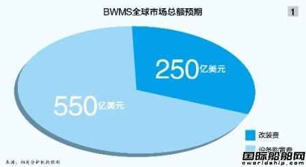 相關(guān)分析機(jī)構(gòu)做出預(yù)測(cè)稱,《壓載水公約》生效后將給BWMS制造商帶來近800億美元的市場總量,對(duì)于BWMS這種船配市場的輕量級(jí)產(chǎn)品來說,這個(gè)數(shù)字是驚人的。另據(jù)某投行交通事業(yè)部的進(jìn)一步分析,這塊800億美元的“大蛋糕”由占總比68.75%、總額達(dá)550億美元的設(shè)備購置市場和占總比31.25%、總額達(dá)250億美元的改裝市場構(gòu)成(見圖1)。