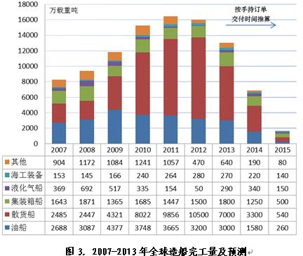 2013年度造船完工量預(yù)測。按手持訂單量交付和后續(xù)訂單交付期安排,同時考慮近幾年訂單未交付情況,預(yù)計2013年約為1.3億載重噸,較上一年下滑15%左右,2014年和2015年將進(jìn)一步下滑。2013年全球造船產(chǎn)能有效利用率加速下降基本上已成定局。