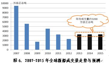 從新船需求來看,近幾年老舊船舶拆解強(qiáng)度顯著加大對“十二五”后三年行情會有很大促進(jìn)作用,預(yù)計2013-2015年期間年均需求預(yù)計約為3200萬修正總噸,其中,2013年成交量約為2960萬修正總噸,2014-2015年成交量有望進(jìn)一步放大到3500萬修正總噸左右。